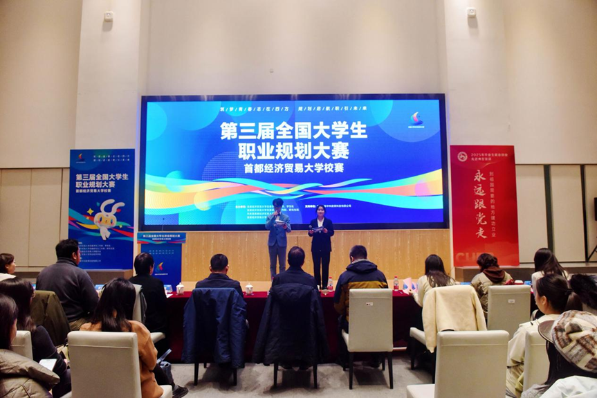 为引导大学生紧跟时代脉搏、将个人成长融入国家发展,深化就业育人工作实效,11月26日下午,首都经济贸易大学第三届大学生职业生涯规划大赛校级决赛暨2025年毕业生就业创业先进典型宣讲活动,在博远楼新闻发布厅和第一报告厅圆满举行。本次活动由学校党委学生工作部、学生处,研究生工作部、研究生院,校团委,劳动经济学院共同主办,北京睿新中科教育科技有限公司提供技术支持,特邀北京外国语大学、北京科技大学、清华大学等高校生涯教育专家,及FESCO校招团队负责人等行业资深人士组成专业评委团,从职业目标清晰度、行动路径可行性、个人与行业契合度等多维度进行综合考评。