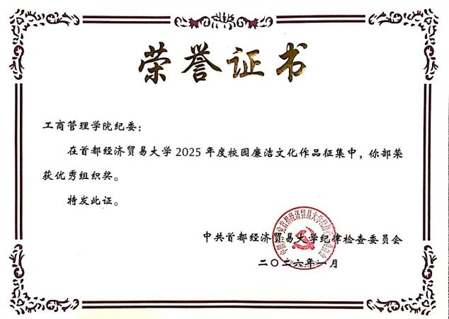 为深入贯彻二十届中央纪委四次全会精神,落实新时代廉洁文化建设要求,校纪委组织开展2025年度廉洁文化作品评选活动。学院选送的作品中共7项获奖,工商管理学院纪委荣获优秀组织奖。